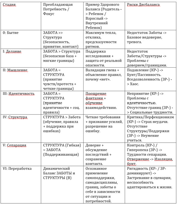 Стадия 0 (Бытие): Преобладает потребность в Заботе (безопасность, принятие, контакт). Структура минимальна (предсказуемость ритмов). Переизбыток Структуры (жесткий режим, игнорирование сигналов ребенка) или недостаток Заботы здесь фатальны.