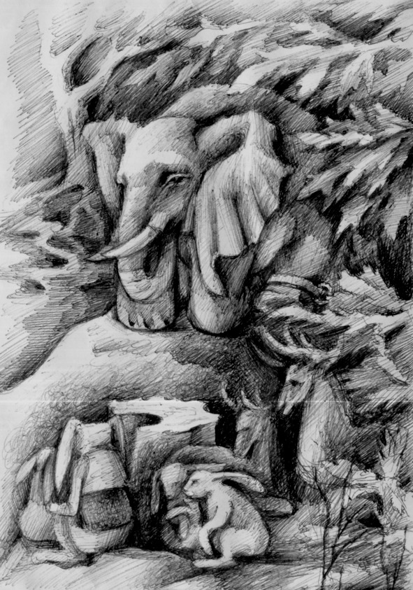 Спросили защитника Зайца.Не смеет ушастый, притих.Конечно, зайчишки боятся.И Слон не в обиде на них.И вот голосуют всем весомМедведи и Волки гурьбой:«Слонище, тиран и повеса,Ответишь ты нам за разбой!»Глаза опустив, голосуютОлени и Белки, дрожа.Слона в кандалы замуруютИ прочь удалятся, спеша.А он никакой не повеса.С своей простоватой душойОн просто для этого лесаБыл слишком, бедняга, большой.2