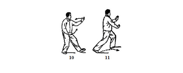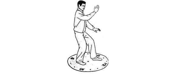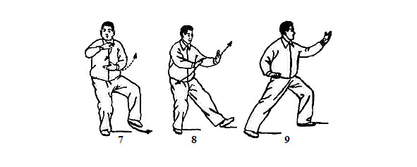 2. Согнуть колено опорной ноги и повернуть корпус налево (10 часов), а левой ногой сделать шаг на 8—9 часов, переместив основной вес на левую ногу. При этом правая нога выпрямляется и ноги формируются в левую позицию «лук-стрела». При повороте корпуса поднять левую кисть до уровня глаз. Ладонь обращена наклонно вверх, рука в локте слегка согнута. Одновременно опустить правую кисть в сторону от правого бока ладонью вниз пальцами вперед. Смотреть на левую кисть (Рис.7—9).