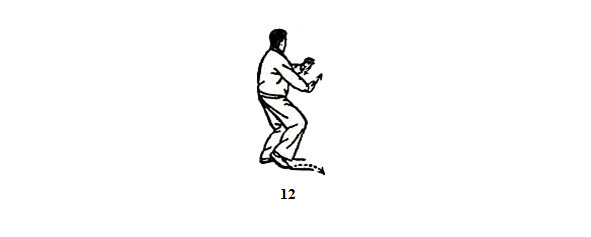3. Медленно смещаясь назад, переместить вес на правую ногу. Носок левой стопы при этом отрывается от пола. Перед выполнением следующего движения развернуть левую стопу наружу. Затем, согнуть левую ногу, поворачиваясь корпусом налево. Вес тела перенести на левую ногу, делая слева от грудной клетки движение «держать мяч», левая кисть сверху. Далее поднести правую стопу к левой опорной ноге (рис. 12). В промежуточном положении пальцы ноги касаются пола. Смотреть на левую кисть (рис. 10—12).