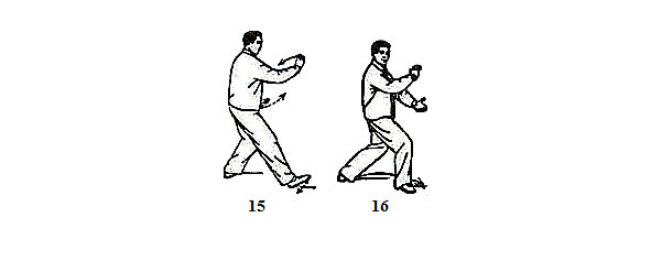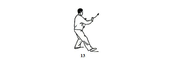 4. Выполнить правую позицию «лук-стрела», сделав правой ногой шаг вперед в направлении 9 часов и выпрямив левую ногу. Одновременно корпус слегка поворачивается направо и кисть медленно поднимается до уровня глаз ладонью наклонно вверх. Рука в локте согнута. В то же время левая ладонь двигается вниз, в сторону от левого бока. Смотреть на правую кисть (рис.13, 14).