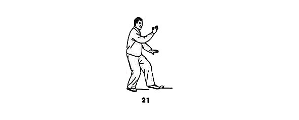 2. Поднести правую ногу на полшага к левой (см. рис. 20) и перенести вес тела на правую ногу, медленно повернув корпус направо (10 часов), разводя руки в стороны. При этом смотреть на правую кисть. Далее вынести левую стопу немного вперед и поставить ее на носок. (Выполняется «пустая» позиция. Обе ноги слегка согнуты). Одновременно с выносом левой стопы корпус поворачивается немного влево (9 часов) и правая кисть устанавливается напротив правого виска ладонью на себя, а левая – ладонью вниз чуть впереди от левого бедра. Смотреть перед собой (рис. 21, 22).