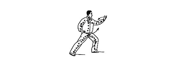 Необходимо осознать, что все движения направляются поясницей и проявляются в конечностях. Поэтому очень важно координировать работу ног, талии и рук, так как в тайцзи цюань они представляются единым целым. При этом течение энергии осуществляется как показано пунктиром на рисунке.