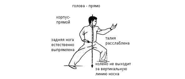 Голова держится прямо, подбородок при этом чуть поджат. Должно быть такое ощущение, будто волосы на макушке тянут вверх. При этом создается впечатление, что голова находится в «подвешенном» состоянии. Плечи естественно опущены и расслаблены. Руки округлые. Локти провисшие и немного согнуты. Пальцы рук естественно распрямлены. При формировании кисти в кулак или «крюк» пальцы также не напрягаются. Тело естественно вытянуто и расслаблено, отдавая приоритет гибкости. Талия расслаблена. Нужно запомнить, что все движения «выходят» из талии: ноги округлые. Бедра естественно напряжены. В позиции «лук-стрела» задняя нога полностью не выпрямляется. Колено передней ноги не выходит за вертикальную линию носка.