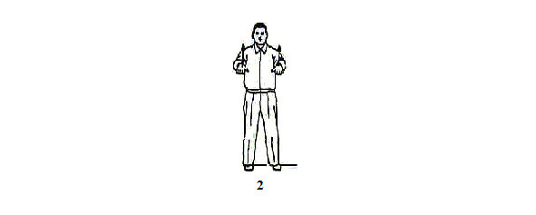 2. Медленно поднять руки перед собой до уровня плеч, ладонями вниз (рис. 2,3).