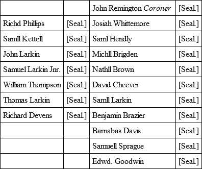 In Witness, Whereof, as Well I the Coroner Aforesaid, as the Jurors Aforesaid, to this Inquisition have Interchangeably put our hands and Seals, the day And year Abovesaid.