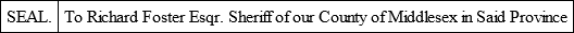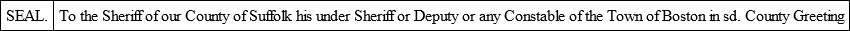 Whereas at our Superiour Court of Judicature Court of Assize and General Goal Delivery begun and held at Cambridge within and for the County of Middlesex on the first Tuesday of August last the Grand Jurors for us for the Body of our said County of Middlesex did on their Oath Present That Phillis a Negro woman of Charlestown in the County of Middlesex Spinster Servant of John Codman late of Charlestown aforesaid Gentleman, not having the fear of God before her Eyes, but of her malice forethought contriving to deprive the Said John Codman her Said master of his life and him feloniously and Traiterously to kill and murder, she the said Phillis on the thirteenth day of June last at Charlestown aforesaid in the dwelling house of the said John there did of her malice forethought willfully felloniously and Traiterously put a Deadly Poison called Arsenick into a Vial of Water and thereby did then and there Poison the same water – and That the said Phillis knowing the water aforesaid to be so poisoned did then and there feloniously willfully traiterously and of her malice forethought put one spoonfull of the same water so poisoned into a pint of the said John's watergruel and thereby poison the same watergruel – and that the said Phillis did then and there of her malice forethought felloniously willfully & traiterously in manner as aforesaid poison the watergruel aforesaid, with a felonious and traiterous Intent and design that the said John her said master then being should then and there eat the Same Watergruel so poisoned and thereby be Poisoned killed and murdered. And that one Elizabeth Codman not knowing the watergruel aforesaid to be so poisoned then and there Innocently gave the Same Watergruel so poisoned as aforesaid to the Said John to eat, and that the Said John then and there being the said Phillis's master and being altogether Ignorant of the watergruel aforesaid's being poisoned as aforesaid and suspecting no Evil did then & there eat the same watergruel so poisoned as aforesaid & that the said Phillis then and there was feloniously and traiterously present with the said Elizabeth & John knowing of & consenting unto the sd. Elizabeth's giving him the said John the watergruel aforesd. so poisoned as aforesaid & his eating the same as aforesd. And that the said John by means of his eating the watergruel aforesaid so poisoned as aforesaid there Languished for the space of Fifteen hours & then at Charlestown aforesaid died of the Poison aforesd. given him as aforesaid – and so the Jurors aforesaid upon their Oath said that the said Phillis did at Charlestown aforesaid of her malice forethought in manner and form aforesaid willfully feloniously and traiterously poison kill & murder the said John Codman her Said master against our Peace Crown & Dignity, and The Jurors aforesaid upon their Oath further present That Mark a Negroman of Charlestown aforesaid Labourer and Servant of the said John Codman before the said Treason and murder aforesaid committed by the said Phillis in manner and form aforesaid did at Charlestown aforesaid on the twentieth day of June last of his malice forethought (the said Mark then being Servant of the said John Codman) felloniously & traiterously advise and incite procure & abet the Said Phillis to do & commit the said Treason & murder aforesaid against our peace crown & Dignity (as in Said Indictmt. is at large Set forth) upon which Indictment the said Phillis and Mark were Severally arraigned and upon their arraignment Severally pleaded not Guilty and for Tryal put themselves on God and the Country, and Whereas the said Phillis & Mark at our Court aforesaid were each of them convict of the crime respectively alledg'd to be committed by them as aforesaid by the Verdict of twelve good & lawful men of our Said County and were by the consideration of our Said Court adjudged to Suffer the Pains of Death therefor; as to us appears of Record Execution of which said Sentence doth still remain to be done we command you therefore that on Thursday the Eighteenth day of September instant between the hours of one & Five o'Clock in the day time you cause the said Phillis to be drawn from our Goal in our County of Middlesex aforesaid (where she now is) to the place of Execution and there be burnt to Death & also that on the Same day between the hours of one & five of the Clock in the day time you cause the Said Mark to be drawn from our Goal in our County of Middlesex aforesaid (where he now is) to the place of Execution & there be hanged up by the Neck until he be dead, & for so doing this shall be your Sufficient Warrant – Hereof fail not; and make Return of this writ with your doings therein into the Clerks Office of our Said Court as soon as may be after you have Executed the Same Witness Stephen Sewall Esqr: at Boston the sixth day of September in the Twenty ninth Year of our reign Annoque Domini 1755 —