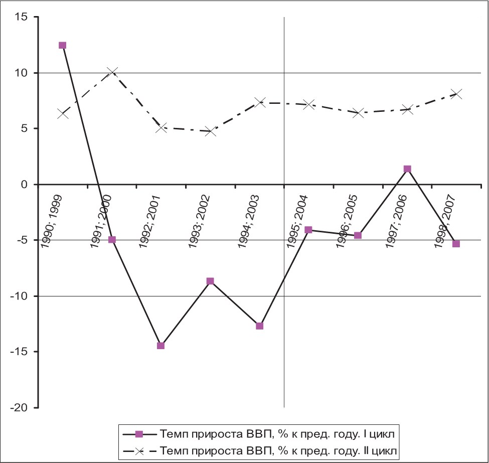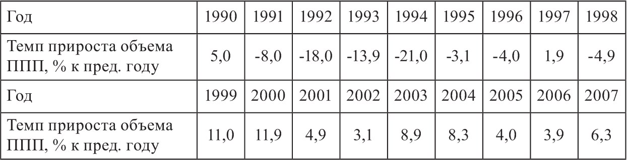 В качестве индикатора кризиса предлагаются два показателя: динамика изменений ВВП и динамика производства промышленной продукции (далее ППП). Проведем анализ каждого из них за период времени (табл. 1.1), соответствующий двум экономическим циклам в России (1989-1999 и 1999-2009 гг.) При этом выясним, насколько возможно их использование в качестве индикаторов.