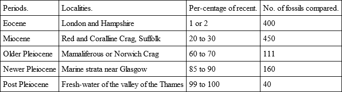 The gradual but rapid approximation of the Tertiary fauna to that of the present surface is well indicated by Mr. Lyell's table (1841) of recent and fossil species in the English formations: —