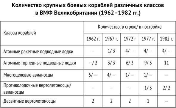 Эти «недоавианосцы» после выбытия старого «Арк Ройяла» должны были стать основой противолодочных группировок и экспедиционных сил флота, тогда как роль главной ударной силы в борьбе за господство на море переходила к торпедным атомным подводным лодкам, которых британцы к концу 1970-х построили 12 единиц и продолжали закладывать, невзирая ни на какие финансовые трудности. В общем аспекте можно подытожить, что за время, прошедшее с окончания Второй мировой войны, британский флот трансформировался в национальной военной доктрине от инструмента, призванного предотвратить распад британской колониальной империи, до средства участия в конфронтации Востока и Запада в рамках холодной войны, где британские ВМС должны были играть роль противолодочного рубежа «передовой обороны» Запада.