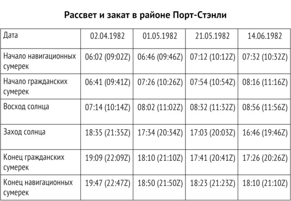 Для того чтобы четко представлять себе события, происходившие в утренние и вечерние часы, важно знать время рассвета и заката и иметь общее понимание этих явлений. Светает и темнеет, особенно в удаленных от экватора широтах, не одномоментно. Сначала наступают так называемые навигационные сумерки, когда темнота преобладает, но небо постепенно окрашивается в утренние тона. Они сменяются гражданскими сумерками – солнце все еще скрыто за горизонтом, но видимость становится уже более или менее приемлемой. И наконец восход солнца знаменует окончательный переход от темного времени суток к светлому. Вечером все происходит в обратном порядке. Из приведенной таблицы видно, как день и ночь сменяли друг друга в районе Порт-Стэнли по аргентинскому и британскому времени в различные даты Фолклендской войны.