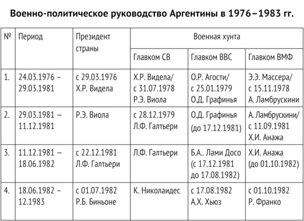 В отличие от соседнего Чили, где генерал Аугусто Пиночет сосредоточил власть в своих руках, аргентинский военный режим не был единолично-диктаторским и основывался на принципах военного корпоративизма. Высшим правящим органом страны являлась Военная коллегия (Junta Militar), или, как ее принято называть, хунта – «триумвират» главнокомандующих видами вооруженных сил, – наделенная правом смещать и назначать президента37 и контролировать его деятельность. Президент страны совместно с членами хунты образовывали Военный комитет (Comité Militar), однако по укоренившейся традиции термин «хунта» используется как обобщенное понятие, означающее военно-политическое руководство Аргентины. Законодательная власть находилась в компетенции Законодательной консультативной комиссии, конклава армейской элиты, перед которым хунта держала ответ по важнейшим вопросам. Состав правящего «триумвирата» в результате соперничества и разногласий, имевших место в среде аргентинского генералитета, и под давлением сложной социально-экономической ситуации неоднократно менялся.