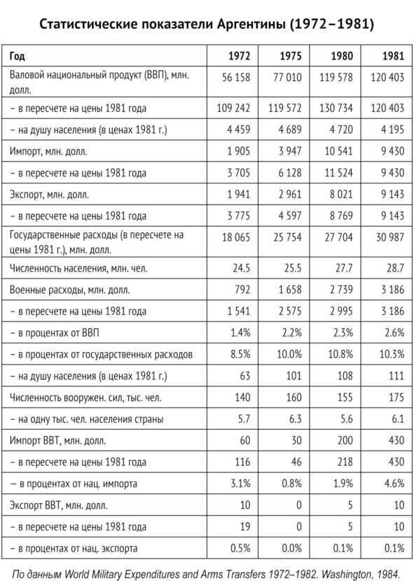 Аргентинские вооруженные силы состоят из регулярных вооруженных сил (исп. Fuerzas Armadas Argentinas), включающих сухопутные войска, военно-воздушные силы и военно-морской флот, а также органы центрального управления, и военизированных формирований в лице национальной жандармерии и службы береговой охраны45. Общая численность регулярных вооруженных сил накануне Фолклендского конфликта составляла около 185,5 тыс. чел., из них сухопутные войска – 130 тыс., ВВС – 19,5 тыс., ВМФ (включая морскую авиацию и морскую пехоту) – 36 тыс. чел. В подготовленном резерве имелось около 250 тыс. человек46.