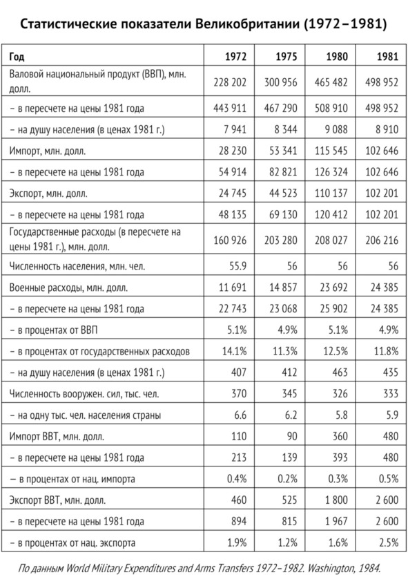 Британские вооруженные силы были единственным институтом, демонстрировавшим невозмутимость в условиях постигших страну социально-экономических катаклизмов. После прихода Тэтчер к власти военные получили 33% индексацию денежного довольствия и имели основания смотреть в будущее с большим оптимизмом, чем любые другие категории «бюджетников». Величина расходов Соединенного Королевства на оборону, в отличие от здравоохранения и образования, сохраняла устойчиво растущую тенденцию. Великобритания взяла на себя обязательство перед НАТО увеличивать их ежегодно на 3% в реальном исчислении. По степени раздутости военного бюджета в соотнесении с ВВП она в начале 1980-х занимала второе место среди стран Западной Европы и третье место в НАТО, уступая по этому показателю только США и Греции.
