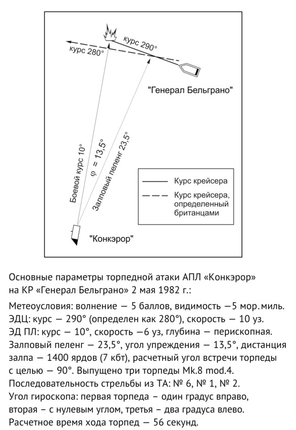 «В этом состояла моя обязанность как координатора атаки, – объяснял позже Макклемент, – хотя адмирал Херберт впоследствии назвал это довольно дерзким поступком в момент первой со времен Второй мировой войны торпедной атаки»18. Командир лодки не стал возражать. Образовавшуюся паузу он заполнил осмотром горизонта и записью в ЖБД: «Больше ничего на видимости, цель М-04 „Бельграно“ не подозревает о моем присутствии. Выжидаем, когда цель придет на курсовой угол 13° правого борта, после чего будет произведен торпедный пуск с нулевым гироскопическим углом». В иной ситуации подобный педантизм, ради чего лодке пришлось на пять минут дольше оставаться на боевом курсе, мог иметь для нее роковые последствия, но в данном случае ей ничто не угрожало.