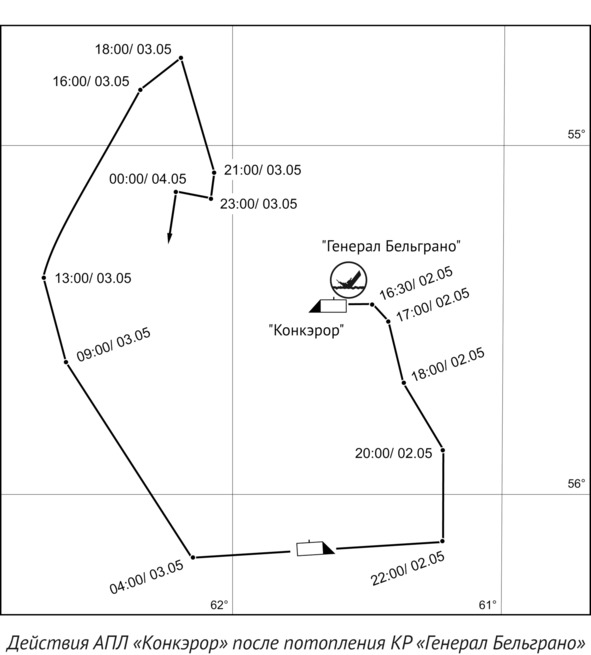 В 14:18 «Конкэрор» нырнул на 60 м, развив ход 16 уз, в 14:45 снова всплыл под перископ, на этот раз оказавшись в 7 кбт за кормой крейсера, а затем предпринял рывок курсом 225° на скорости 21 уз и глубине 115 м. В 15:09 сыграли боевую тревогу. В ходе следующего поднятия перископа, в 15:16—15:20, лодка была уже на левом фланге аргентинского отряда. «Бельграно» наблюдался по пеленгу 20°, дистанция 26 кбт, ЭДЦ: курс 274°, скорость 10 уз. Слева в отдалении проглядывался силуэт одного из эсминцев. Что примечательно, аргентинцы, по мнению командира лодки, совершали противолодочный зигзаг, но очень «вялый», в пределах 30° влево-вправо от генерального курса 270°, или, как выразился штурман «Конкэрора» лейтенант-коммандер Джонатан Поуис, даже не зигзаг, а «некие очень длинные плавные изменения курса». С аргентинской стороны, кроме поворота на курс 290° в 15:20, следование отряда переменными галсами не подтверждается. В противоборстве с атомной субмариной зигзаг на скорости десять узлов не имел смысла, британцы же просто неверно оценивали параметры движения цели.