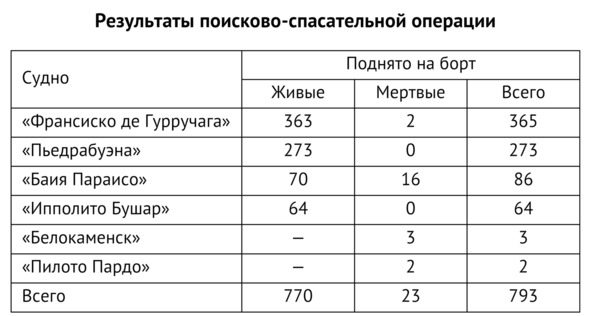 «С траулеров ушли радиограммы в Минрыбхоз СССР, его руководство связалось с МИДом. Потом последовали переговоры с Форин оффисом, занявшие около суток. Наконец, разрешение было получено, и несколько советских судов двинулись от острова Новая Скоттия29 и острова Мордвинова, близ которых вели промысел криля, к водам над затонувшим крейсером. Быстрее других к месту торпедирования подошел севастопольский БМРТ “Белокаменск”. “Надежд у нас почти не было, – припомнил по моей просьбе бывший технолог траулера, кандидат биологических наук Василий Терентьев, – температура воды не поднималась выше семи градусов, суточное промедление должно было наверняка сгубить уцелевших после торпедирования. Так и оказалось…” Рыбаки смогли высмотреть среди волн только пятерых аргентинцев в красных спасательных жилетах. Никто из них признаков жизни не подавал30. Лица моряков были обезображены клювами чаек, птицы расклевали им глаза и губы. Тела убрали в морозильную камеру и еще несколько часов бороздили океан, пока из Москвы не пришел приказ прекратить поиски и отправиться в ближайший порт Аргентины. Сойти на берег, впрочем, Москва не разрешила. Трупы перегрузили на борт подошедшего катера и потом наблюдали в бинокли с рейда, как причал заполнили едва ли не все жители городка Рио-Гальегос».