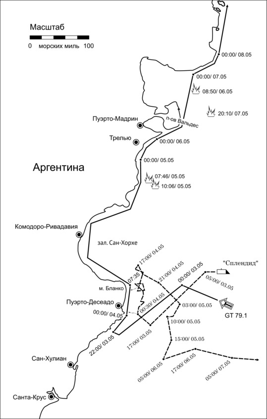 Однако главной противолодочной «фишкой» командования ВМФ Аргентины было использование мелководья, под которым понимались водные районы с глубинами менее ста метров. Расчет строился на том, что малые глубины вблизи от своих берегов и в зал. Сан-Хорхе сводят на нет преимущества атомных субмарин противника и делают их легкой добычей для сил ПЛО. Во-первых, атомная подводная лодка довольно неповоротлива и инертна, поэтому для маневрирования на большой скорости без риска столкновения с дном нуждается в больших глубинах. Во-вторых, двигаясь в приповерхностном слое воды, она оставляет хорошо видимый с воздуха кильватерный след. В-третьих, условия мелководья в значительной мере компенсировали бы недостатки устаревших противолодочных торпед Mk.44. Считалось, что британские подводники не решатся атаковать там, где недостаточно глубоко, поэтому вместо стремительного отхода на север GT 79.1 неспешно следовала вдоль материкового побережья. Эта тактика сработала, но довольно неожиданным образом. Как показал опыт, малые глубины сами по себе не гарантировали безопасности: в районе Пуэрто-Десеадо – мыс Бланко, где произошла встреча с АПЛ «Сплендид», до дна было не больше 80 метров. В то же время привязанность аргентинских моряков к прибрежному мелководью означала, что большую часть своего пути группа авианосца «25 мая» проделала, находясь в 12-мильных территориальных водах Аргентины, где командирам британских подводных лодок запрещалось применять оружие. Таким образом, противоборство между британскими подводниками и аргентинскими противолодочниками было по-своему «нечестным» с обеих сторон, с британской – ввиду значительного технического превосходства новейшей атомной субмарины, с аргентинской – потому что авианосец оставался заведомо недосягаемым для атак, тогда как сам имел возможность неограниченно производить поиск и наносить удары с воздуха.