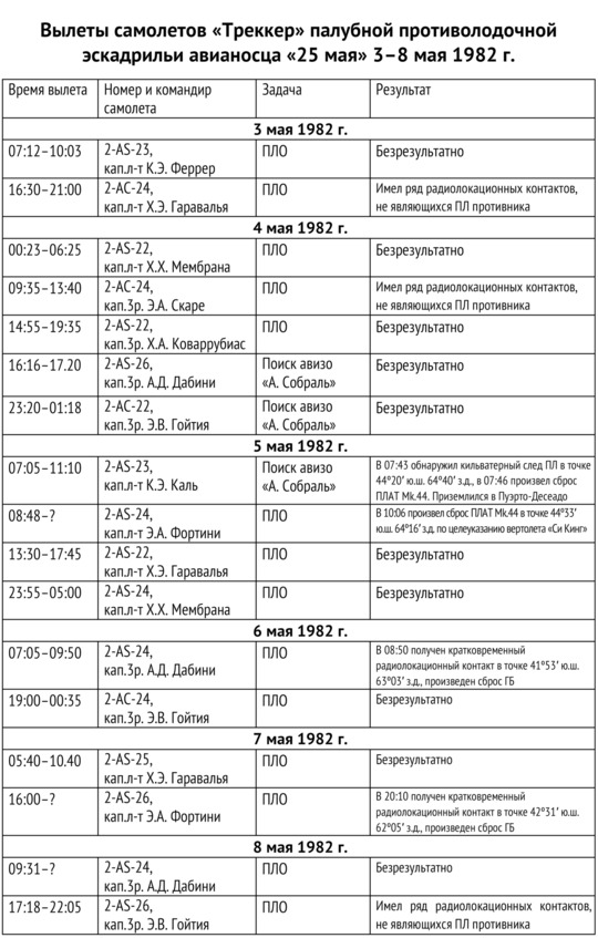 Основными способами обнаружения подводных лодок самолетами «Треккер» были радиолокационный поиск и постановка барьеров из радиогидроакустических буев. Не имея технической возможности контролировать сразу все РГБ, бортоператор переключался между ними каждые 15 минут. Противолодочные вылеты осуществлялись как днем, так и ночью, что уже само по себе было для аргентинцев достижением. Мы помним, что аргентинские палубные штурмовики «Скайхок» могли действовать только в светлое время суток. А утром 4 мая капитан-лейтенанту Хуану Мембране пришлось сажать свой «Треккер» в условиях темноты и сильного тумана, и летчик блестяще справился с этой трудной задачей, правда, со второго захода и только после того, как авианосец на время включил все огни. Однако в отношении интенсивности проводимого поиска большого рвения проявлено не было. В течение 3—8 мая противолодочная эскадрилья «Бентисинко де Мажо» совершала для решения противолодочных задач по два-три вылета ежесуточно, а длительность патрулирования в воздухе сильно недотягивала до максимально возможной (см. таблицу). И результат получился достаточно логичным – ни одного реального обнаружения и четыре воздушные атаки, все по ложным целям. Впрочем, он в значительной мере соответствовал и сложившемуся на тот период общему балансу в состязании подводных лодок и сил ПЛО, в котором первенство было не за противолодочниками.