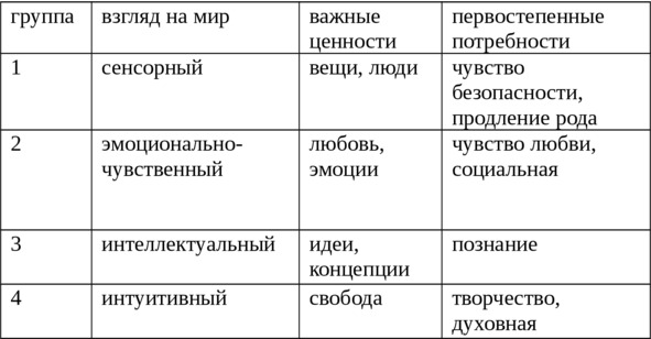 В таблице вы видите четыре группы, каждая из которых рассматривает особенности психики человека. Каждая из групп содержит определенный взгляд на мир, важные ценности, а также первостепенные потребности.