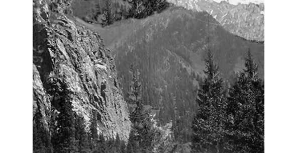 Неожиданное происшествие взбодрило, и дальнейшая дорога не казалась трудной. Оставив в стороне небольшой, скорее всего егерский дом, вышли на тропу, поднимающуюся к вершине. Из земли выступали коренья деревьев, и создавалось впечатление, ступенек необычной лестницы. Незаметно достигли седловины перевала и зачарованно остановились, поражённые незабываемым виденьем. Петляющая тропинка круто опускалась вниз, к бурной горной речке. На противоположной стороне ущелья, сразу за изумительной красоты поляной, высилась высокая скала.