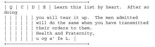 It was only later on that the persons who were in the secret of this find at the time, learned the significance of those four capital letters: quinturions, centurions, decurions, éclaireurs [scouts], and the sense of the letters: u og a’ fe, which was a date, and meant April 15th, 1832. Under each capital letter were inscribed names followed by very characteristic notes. Thus: Q. Bannerel. 8 guns, 83 cartridges. A safe man. – C. Boubière. 1 pistol, 40 cartridges. – D. Rollet. 1 foil, 1 pistol, 1 pound of powder. – E. Tessier. 1 sword, 1 cartridge-box. Exact. – Terreur. 8 guns. Brave, etc.
