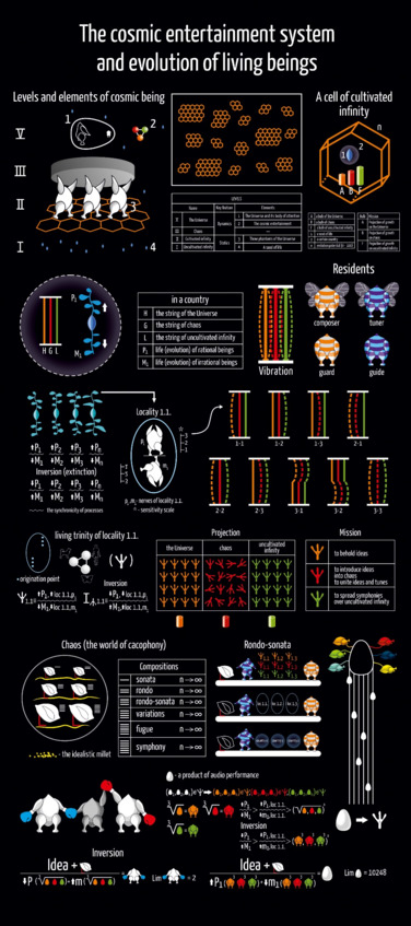 3The opportunity for such a combination arises when the growth of P and M (evolution of rational and irrational beings) is projected onto three levels of cosmic being – the Universe, chaos, and uncultivated infinity. The purpose of this projection is not entertainment. The need to broadcast the growth of plants P and M is explained by the fact that only the power of evolution can transform a musical composition into a vital egg.