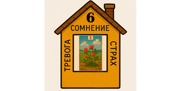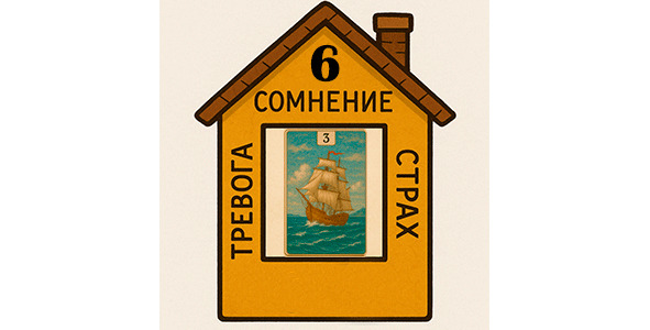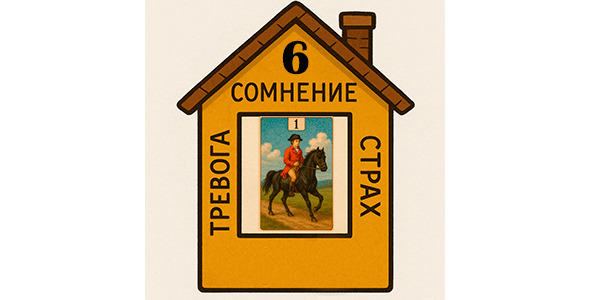 Дом №6 также связан с боязнью будущего. Всё, что проявляется через него, окрашено опасениями: перемены кажутся рискованными, потери – возможными, а неизвестность воспринимается как угроза. Карта, оказавшаяся здесь, подскажет, чего именно человек боится – даже если сам он не решается назвать это вслух.