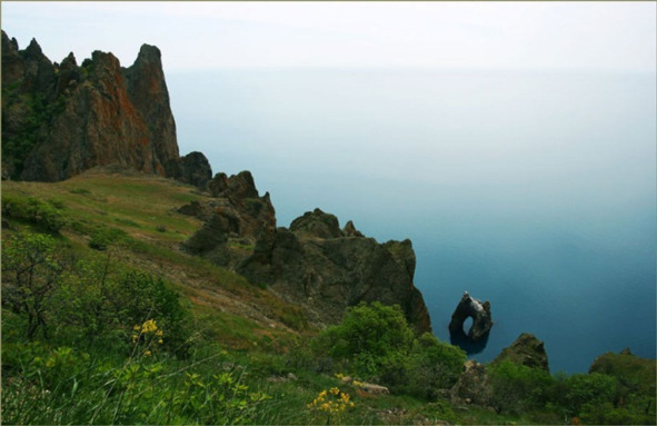 Тогда он показал тропинку, как обойти военную часть и мы пошли траверсом влево. Военная часть занимало большую площадь, мы долго её обходили, и вышли на яйлу как раз над бухтой Льва. Были хорошо видны Золотые Ворота, скала Разбойник. Очень хотелось пить, внизу стояло несколько палаток, и мы начали спускаться к ним.