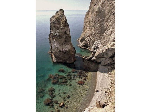 До Кара-Дага добрались без особых приключений, там сразу дошли до бухты-Барахты. Прекрасное место: небольшой галечниковый пляж длиной метров тридцать, с обеих сторон закрытый стенами. Прямо в море, в 10 м от берега скала Парус, высотой 30 м. Она и правда напоминала большой парус.