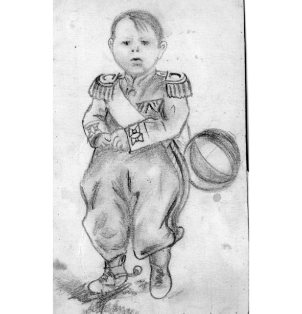 Среди детских фотографий давний рисунок карандашом на плотной желтоватой бумаге: неулыбчивый круглолицый малыш в старинном мундире с эполетами, лентой через плечо, армейских ботинках со шпорами, а на поясе вместо сабли – большой полосатый мяч. На обороте читаю: «Генерал Игорь, „Бодяга, Буляга, Гуляга“. Исполнил В. Дебеленко. 2 сентября 47г.»