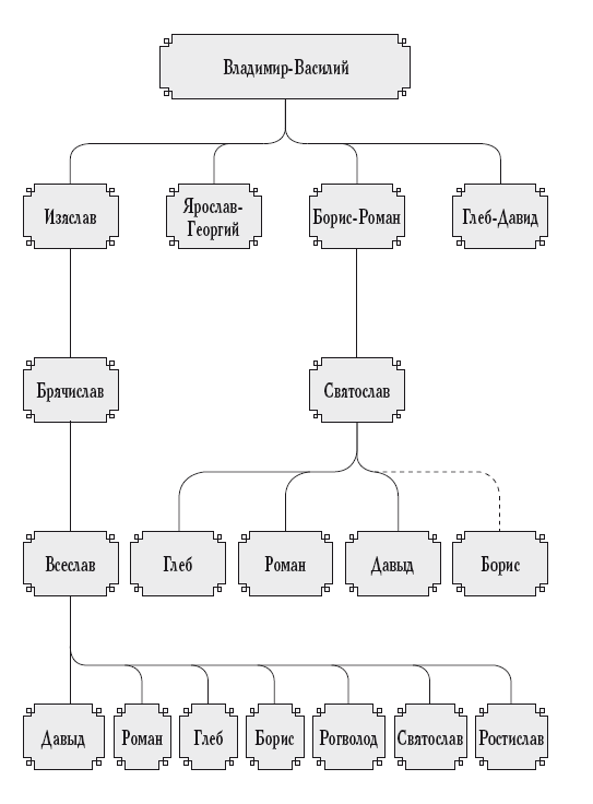 Особенно забавно смотрятся ситуации, когда все четыре имени в паре Бориса-Романа и Глеба-Давида становятся отдельными частями, которые отец раздает своим сыновьям. Например, у полоцкого князя Брячислава Изяславича (1003–1044) помимо прочих были четыре сына, носивших соответственно имена Роман, Давид, Глеб и Борис. И это даже не единичный случай!