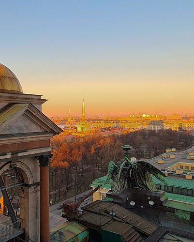 Поднимаюсь на смотровую площадку Исаакиевского собора и встречаю закат: город окрашивается в розовые оттенки, в воздухе морозная свежесть.