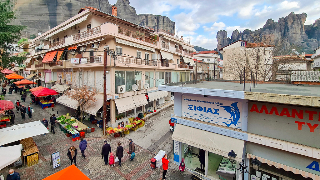 На поезде до города Каламбака. Бесконтактно заселяюсь в просторную квартиру, завариваю чай, беру приветственный десерт и выношу всё это на террасу. С террасы открывается вид на величественные скалы.