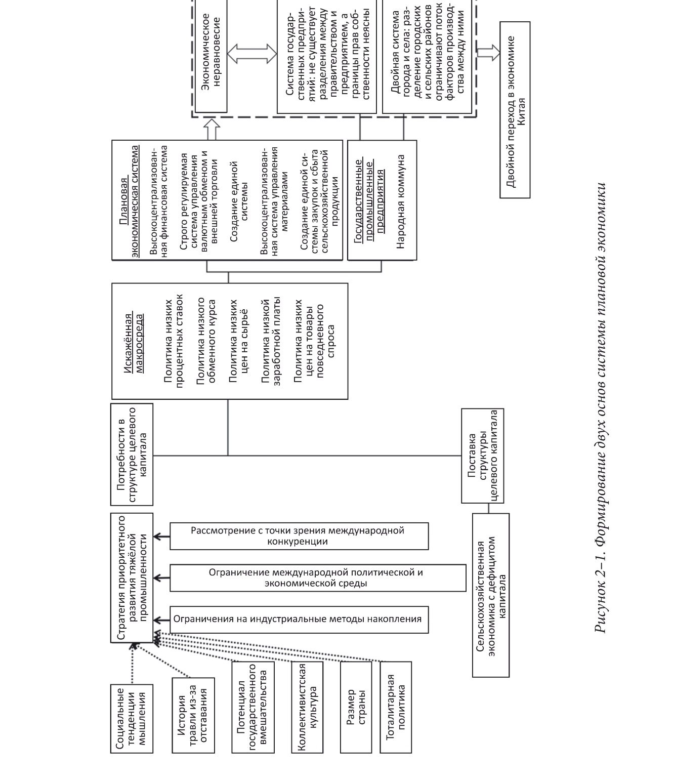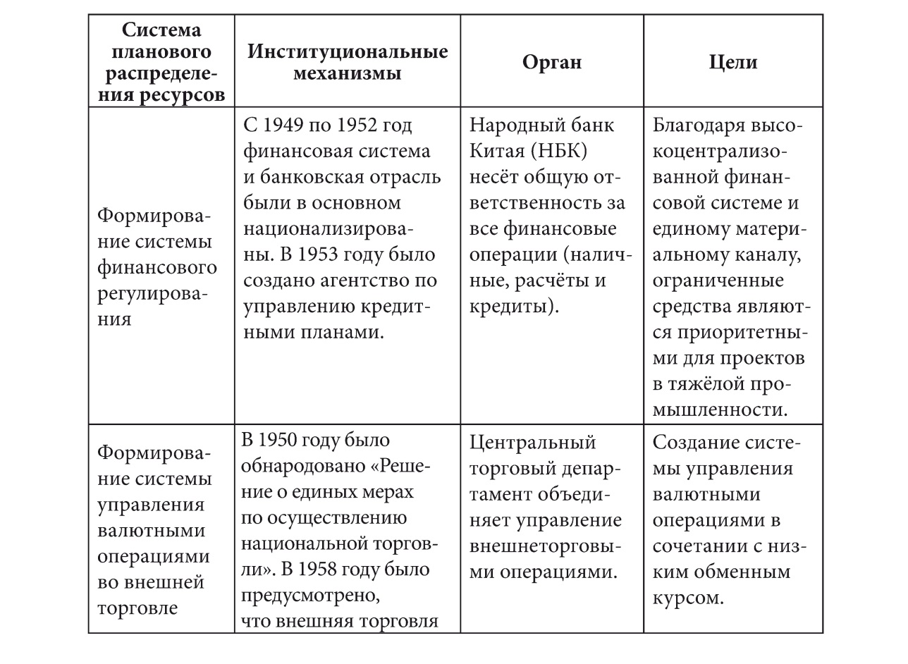 Во-первых, формирование системы финансового регулирования. На конкурентном финансовом рынке, если процентная ставка по депозитам ниже альтернативной стоимости средств, обычным результатом является снижение готовности держателей сбережений, и объём средств, который банки могут абсорбировать, значительно меньше потенциального предложения средств обществу. При наличии других источников финансирования сбережения будут поступать не в банки, а в другие каналы. Поскольку политика сдерживания процентных ставок направлена на приоритетное развитие тяжёлой промышленности, а неподконтрольные государству финансовые каналы не в состоянии выполнить задачу приоритетного развития тяжёлой промышленности, необходимо введение финансовой монополии. В условиях большого количества желающих получить капитал, распределение ограниченного капитала между предприятиями и отраслями, отвечающими стратегическим целям национального развития, требует эффективной и централизованной системы распределения капитала (как показано в таблице 2–1). Благодаря высокоцентрализованной финансовой системе и единому материальному каналу ограниченные средства приоритетно направлялись на проекты тяжёлой промышленности. Во-вторых, формирование системы управления валютной внешней торговлей. Если цена иностранной валюты будет искажена ниже равновесного уровня, это будет означать, что производители экспорта, чья продукция оценивается в иностранной валюте по более низкой цене, чем в национальной, не смогут экономически выгодно экспортировать, что приведёт к тому, что никто не захочет экспортировать, и иностранная валюта будет истощена. Для импортёров низкий обменный курс означает, что использовать импорт дешевле, чем отечественную продукцию, и отрасли стремятся ввозить как можно больше ресурсов из-за рубежа. Чтобы разрешить это противоречие, государству необходимо создать ряд институциональных механизмов для осуществления экспортных операций. Поэтому монополия государства на внешнюю торговлю и набор высокорегулируемых систем управления внешней торговлей крайне необходимы. Как показано в таблице 2–1, контроль государства над внешней торговлей начался ещё в 1950 году. Благодаря ряду вспомогательных мер и созданию институтов, с политикой низкого обменного курса в соответствии с внешней торговлей и системой управления иностранной валютой, была сформирована система управления материальными ресурсами.