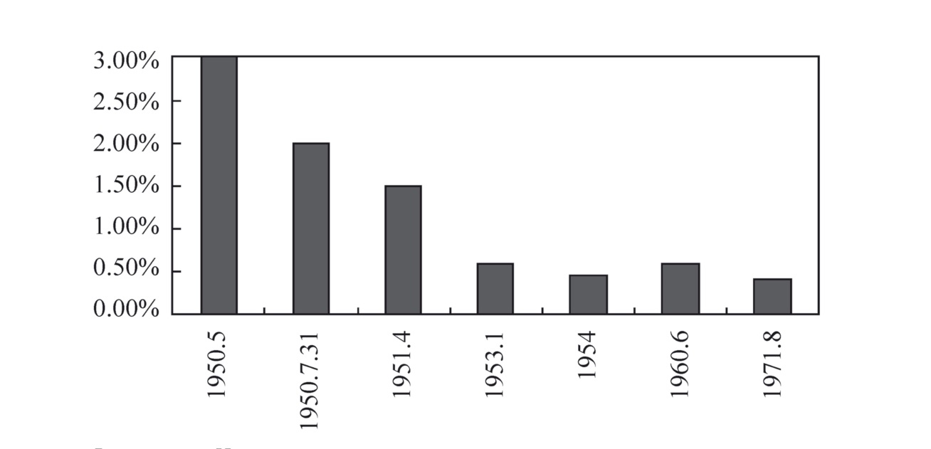 Во-первых, политика низких процентных ставок. Поскольку тяжёлая промышленность является высококапиталоёмкой и имеет длительный период строительства, если позволить цене капитала стихийно формироваться на рынке, средства, необходимые для строительства тяжёлой промышленности, не будут реализованы из-за высоких процентных ставок. Поэтому первым и главным условием обеспечения быстрого роста тяжёлой промышленности при низкой стоимости строительного капитала было снижение цены капитала и поддержание стабильно низкой процентной ставки. Действительно, после основания Нового Китая, с начала борьбы с инфляцией и до первой половины 1950 года, процентная ставка стала постоянно снижаться и оставалась низкой в течение длительного времени, как показано на рис. 2–2.
