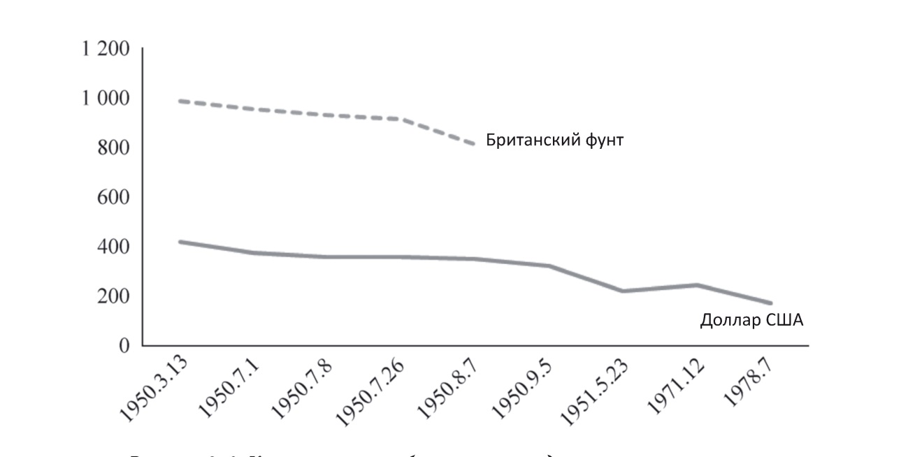 При отсутствии капитала и изобилия экспортной продукции иностранная валюта и капитал одинаково дефицитны, поэтому скорректированный на рыночную стоимость обменный курс будет слишком высок для капиталоёмкого сектора тяжёлой промышленности. Поэтому, чтобы обеспечить предприятиям тяжёлой промышленности возможность импортировать необходимое ключевое оборудование по более низким ценам, государству необходимо вмешаться в формирование валютного курса. Завышение курса национальной валюты и проведение политики низких обменных курсов стало важной гарантией выполнения приоритетных задач роста тяжёлой промышленности. Как показано на рис. 2–3, подавление обменного курса началось в 1950 году, когда в период с марта 1950 года по май 1951 года курс юаня к доллару снизился на 15 пунктов подряд, а к 1972 году обменный курс Китая стабилизировался на очень низком уровне.