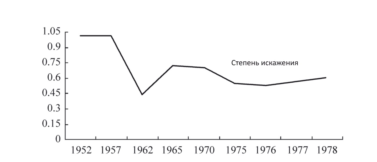 Для решения этой проблемы необходимо проводить политику низких цен на сельскохозяйственную продукцию и другие жизненно необходимые товары и услуги, а также снижать затраты на воспроизводство рабочей силы, чтобы они были соизмеримы с низкой оплатой труда. Кроме того, ценовая политика, направленная на приоритетное развитие тяжёлой промышленности, искажает уровень цен на сельскохозяйственную продукцию и другие товары первой необходимости, институционализирует и закрепляет эти искажения. Как показано на рисунке 2–5, данные за период 1952–1978 годов свидетельствуют об усилении этих искажений. Этот индекс цен отражает искажения, вызванные макроэкономической политикой.