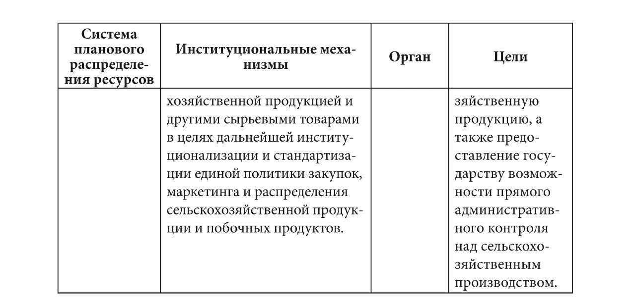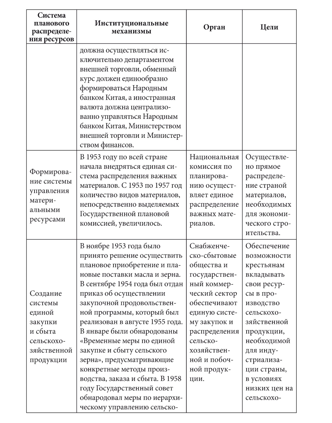 При условии, что дефицит становится нормой, полностью конкурентный рынок может очистить рынок с помощью цен, но в случае искусственно заниженных цен спрос искусственно стимулируется, а энтузиазм предложения подавляется, что приводит к дисбалансу между спросом и предложением. В ситуации, когда дисбаланс между спросом и предложением стал нормой, необходимо создать высокоцентрализованную систему управления материалами, действующую в соответствии с планом, чтобы материалы в первую очередь удовлетворяли потребности приоритетного развития тяжёлой промышленности. Для реализации прямого распределения материалов, необходимых для экономического строительства, принимается ряд мер и организационных мероприятий (см. табл. 2–1). Наконец, была создана система единой закупки и сбыта сельскохозяйственной продукции. Политика закупки этой продукции по низким ценам в целях приоритетного развития тяжёлой промышленности не только подавляла стимул крестьян к производству, но и снижала их заинтересованность в продаже сельскохозяйственной продукции государству. Чтобы получить достаточное количество зерна, хлопка, масла и других продуктов для обеспечения повседневного потребления городского населения и поставок сырья на перерабатывающие предприятия, необходимо было ввести торговую монополию на основные сельскохозяйственные и побочные продукты, то есть систему единой закупки и распределения. Чтобы крестьяне по-прежнему могли инвестировать свои ресурсы в производство сельскохозяйственной продукции, необходимой для национальной индустриализации, в условиях недорогостоящих единых закупок и диспетчеризации, необходимо создать обязательное институциональное соглашение, позволяющее государству напрямую контролировать сельскохозяйственное производство с помощью административной власти. Был разработан ряд стратегий и институтов, указанных в таблице 2–1, для обеспечения их реализации.
