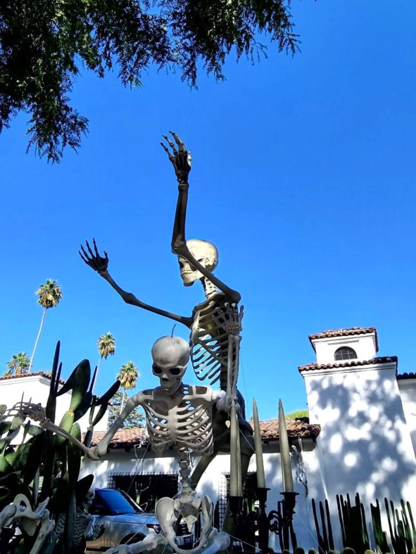 Как и к Рождеству, к Хэллоуину готовятся задолго до его наступления. Мы, например, в начале октября там были, а скелетики уже присутствовали вовсю. На заборах висели, на деревья карабкались, на газонах валялись. Предела ужасному нет, о чувстве меры не может быть и речи. Америка же ж. Представьте, и все светятся. Был ясный солнечный день, а представляю, каковы ощущения ночью.