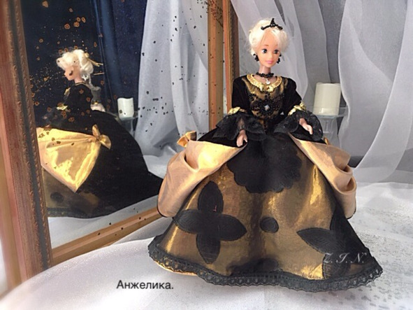 Он улыбнулся, галантно приподнял шляпу – поприветствовал её. Поклонился. Анжелика была в черном, бархатном платье со шлейфом. Нижняя юбка из золотой парчи перекрыта черным гипюром, с боков заложена красивыми складками и украшена бантами.