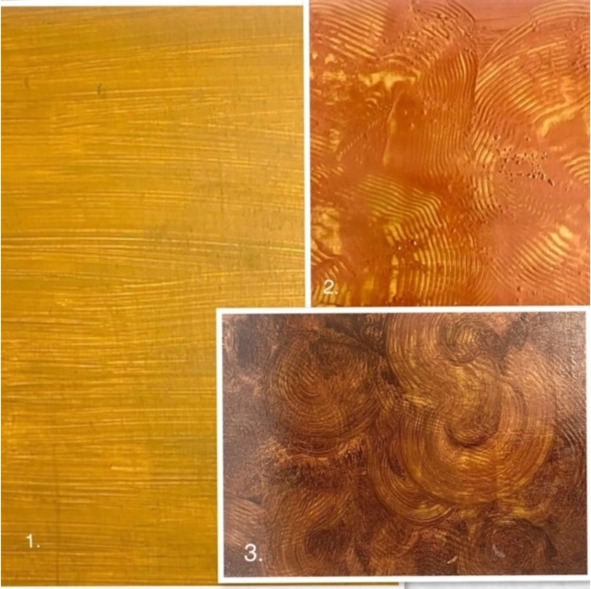Третий слой краски – умбра жженая+сиенна жженая+черная+вода. Нанести широкой кистью жидкую краску и зубчатым шпателем прорисовать волнообразные хаотичные линии, тем самым обнажая предыдущий слой. Лак 2—3 слоя. Просушить. (Рис. 1.3. поз.3).