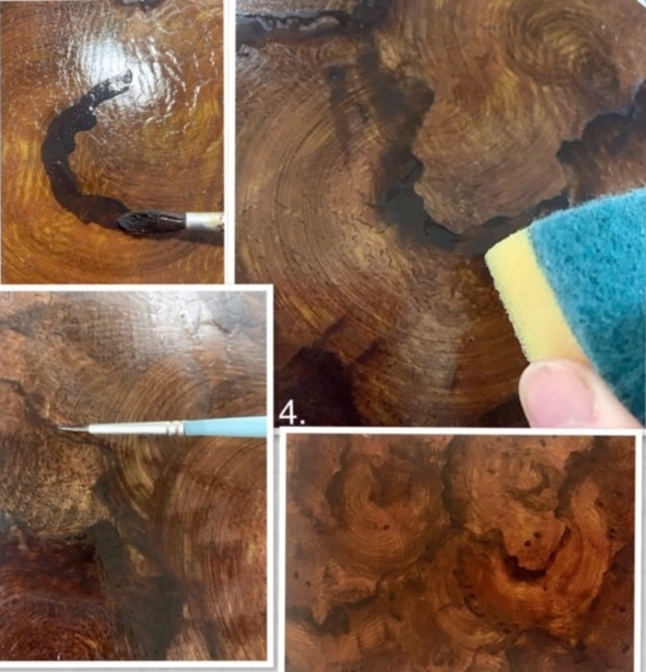 Четвертый слой краски – умбра жженая+сажа газовая (черная краска) +вода. Нанести круглой тонкой кистью длинные линии, имитирующие темные участки дерева, прокручивая кисть и поворачивая ее в разные стороны. Очень толстые линии подтереть кисточкой или влажной салфеткой. Губкой «почпокать» поверх линий в некоторых местах. Тонкой кистью добавить извилистых линий, имитирующих рисунок дерева. Поставить точки черной краской в некоторых местах. Просушить. Нанести 2—3 слоя глянцевого акрилового лака. Последний слой – матовый лак. (Рис. 1.4. поз.4).