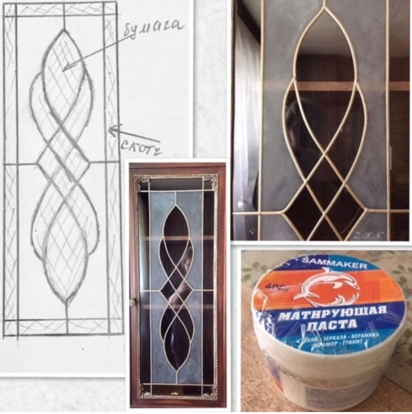 Приклеить отделочные рейки по краю дверки и внутренние срезы закрыть штапиком. (Можно добавить витражную ленту, но это не обязательно).