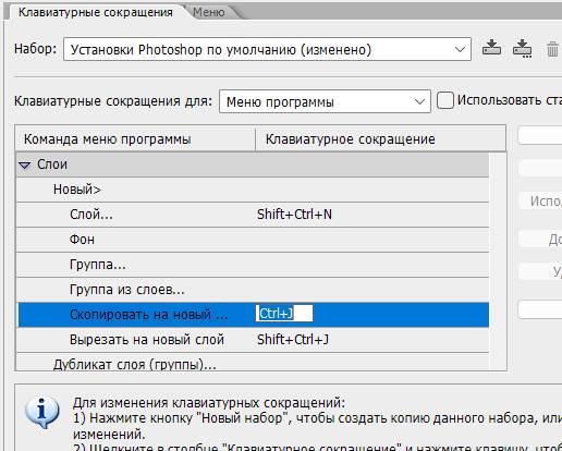Использование «горячих» клавиш (клавиатурных сокращений)В Photoshop есть множество сочетаний «горячих» клавиш, которые можно использовать для быстрого управления слоями. Научившись использовать «горячие» клавиши, вы можете значительно сократить время своей работы и повысить эффективность. Например, комбинация клавиш Ctrl + J позволяет дублировать выделенный слой или его часть в новый слой (функция называется «Слой через копирование»), Ctrl + Shift + J – слой через обрезание, часть выделенного слоя будет вырезана в новый слой, а Ctrl + G – сгруппировать слои с объединением их в папку.