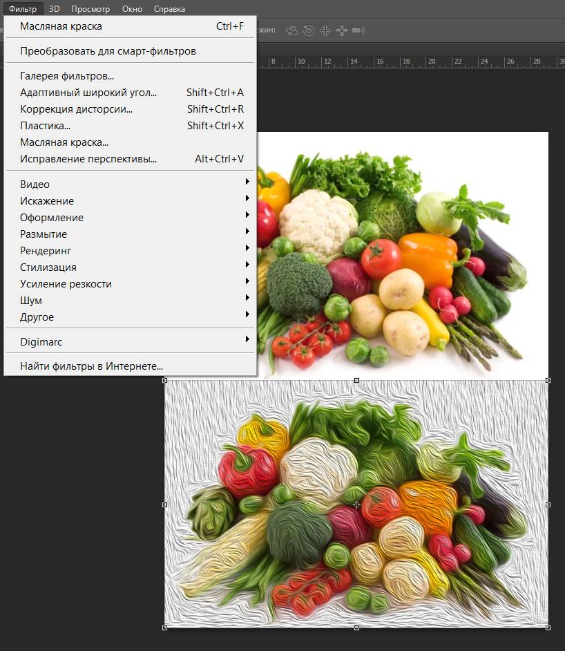 Рис. 14. Фото овощей и эффект «Масляная краска», примененный к этому изображению (внизу)