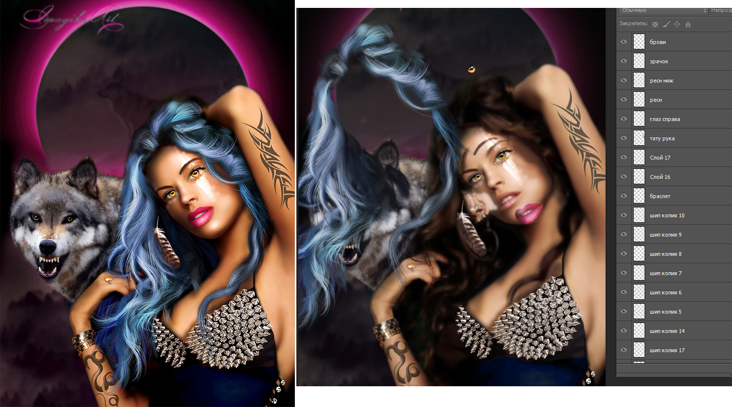 Рис. 18. Цифровая живопись (слева), референс послойно (справа)