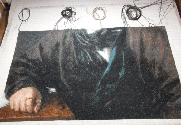 В результате портрет был отшит на гобеленовой канве в технике полукрест. Что касается количества оттенков, то их в вышивке использовано 150, то есть 150 игл с нитками разных оттенков заранее готовится для работы. Чтобы справиться с таким хозяйством, есть проверенные приемы. Любительницы схем ГК называют их технологией организации процесса вышивки. Кстати скажу, что не каждая вышивальщица психологически готова к подобной технологии. В этом особенность и сложность схем ГК, дающих возможность передать копируемую картину максимально близко к оригиналу. Большое количество оттенков, при сдержанной, немногоцветной палитре портрета, передает глубину цвета, его сложность, позволяет не выглядеть плоско. Вышитая картина не копирует технику письма, у нее своя фактура. В этом ее отличие от подлинника и особое очарование.