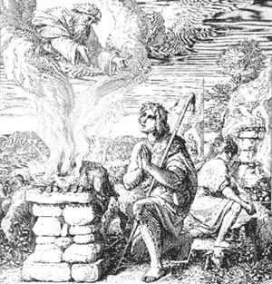 Авраам (первоначально Аврам) – ветхозаветный патриарх и родоначальник еврейского народа, родившийся в городе Ур, в Северной Месопотамии, за 2040 лет до н. э. Живя среди языческого мира, он первый познал лживость служения идолам и постиг существование единого Бога, апостолом которого он и сделался. Чтобы испытать силу веры Авраама, к нему последовало повеление Божие принести в жертву сына Исаака на горе Мории. Авраам не колеблясь повиновался, но в самый решительный момент, когда Исаак лежал связанный на алтаре и Авраам занес уже нож, чтобы вонзить в сына, но ангел приостановил его и спас юношу.