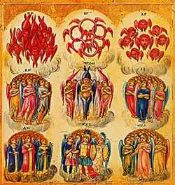 Икона, изображающая 3 иерархии ангелов. Обратите внимание чем ниже иерархия, тем «человечнее» образы ангелов.